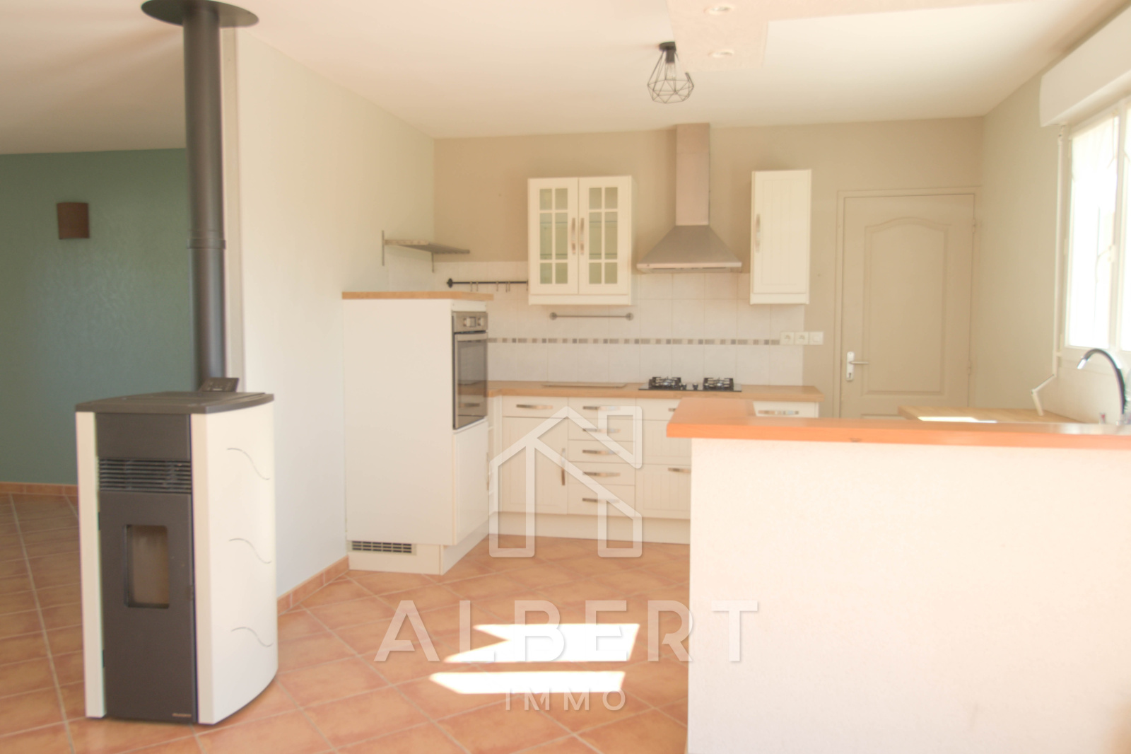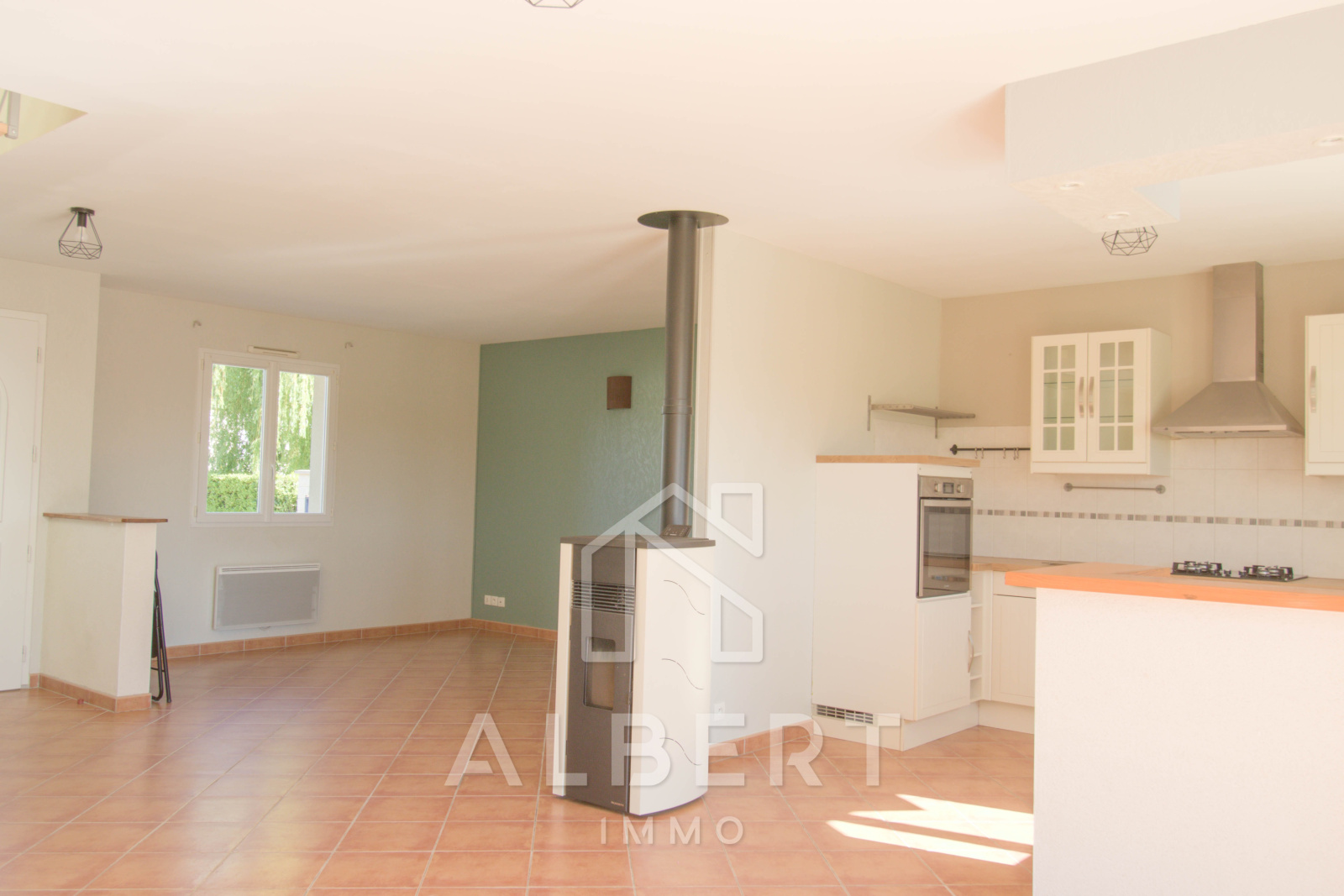 Le rez-de-chaussée se compose d'une chaleureuse pièce de vie avec poêle à granulés, d'une cuisine ouverte aménagée et équipée, de trois chambres avec rangements, d'une salle d'eau et d'un W.C. Ce même niveau accueille une arrière cuisine/ buanderie et un garage.